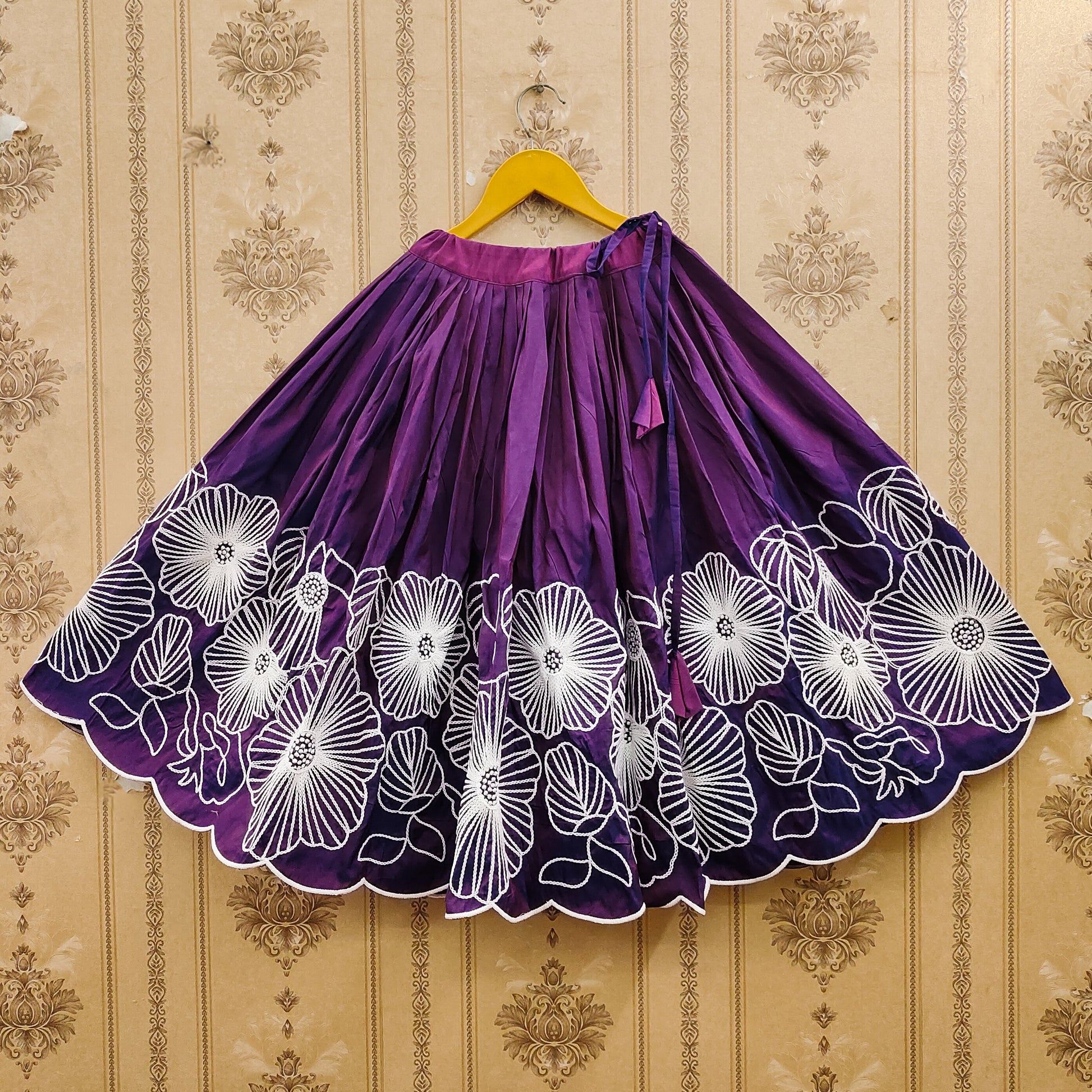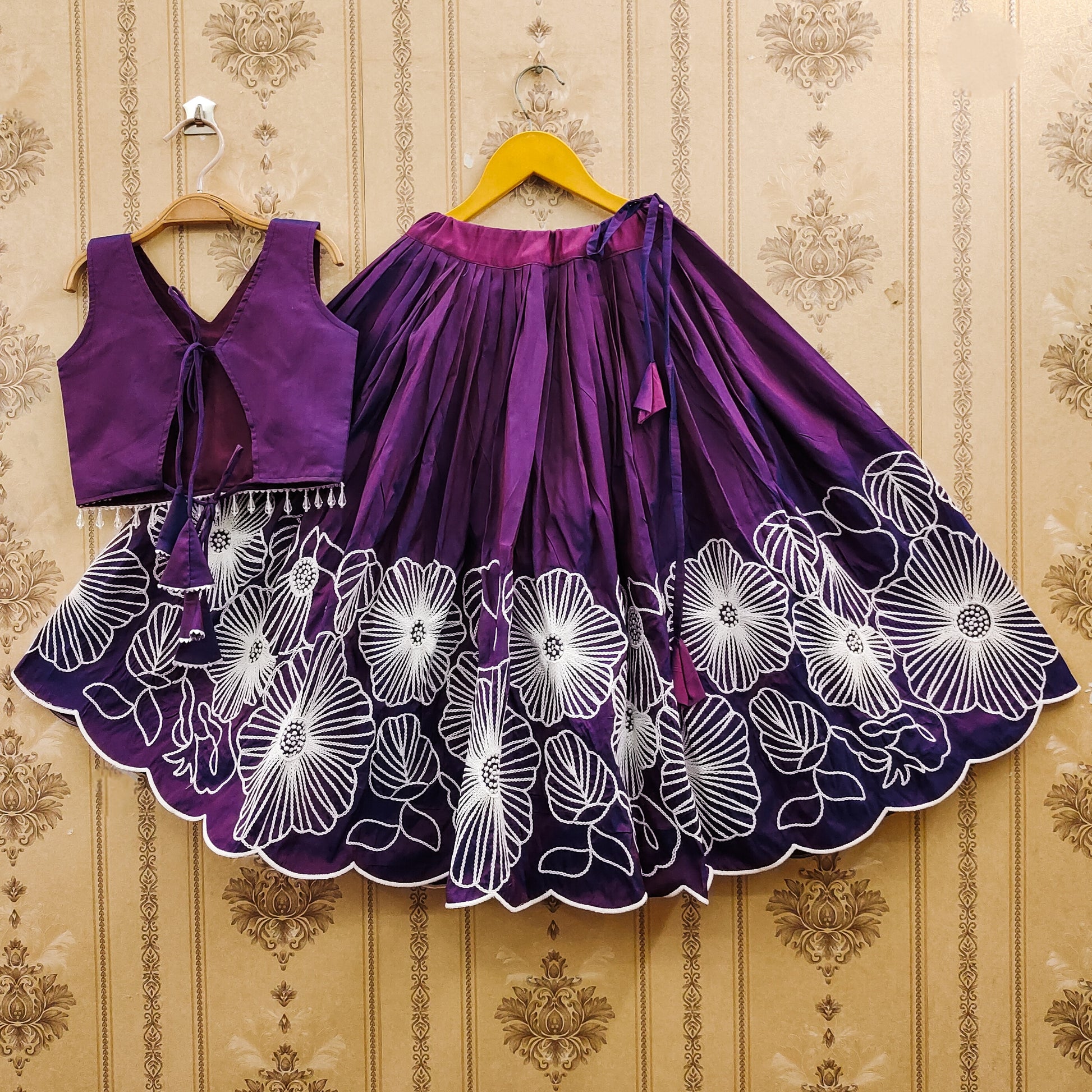 The ensemble features an intricately embroidered choli adorned with delicate cording, thread and dori work. Fully stitched and ready to wear, Wine color , it ensures both comfort and style for your little one. Perfect for festivals, weddings, birthdays, and family gatherings, this beautifully crafted outfit celebrates the playful elegance of childhood.