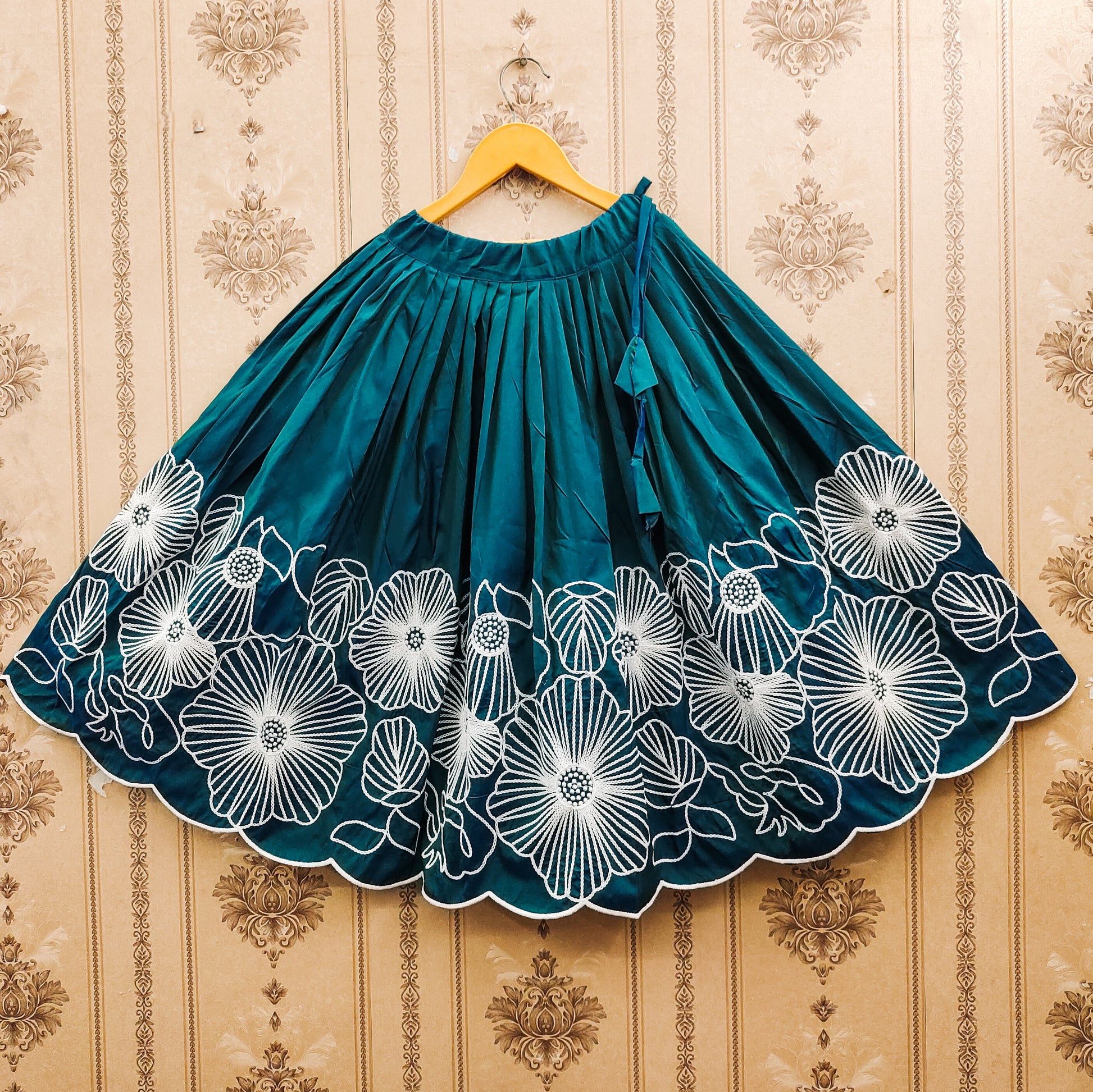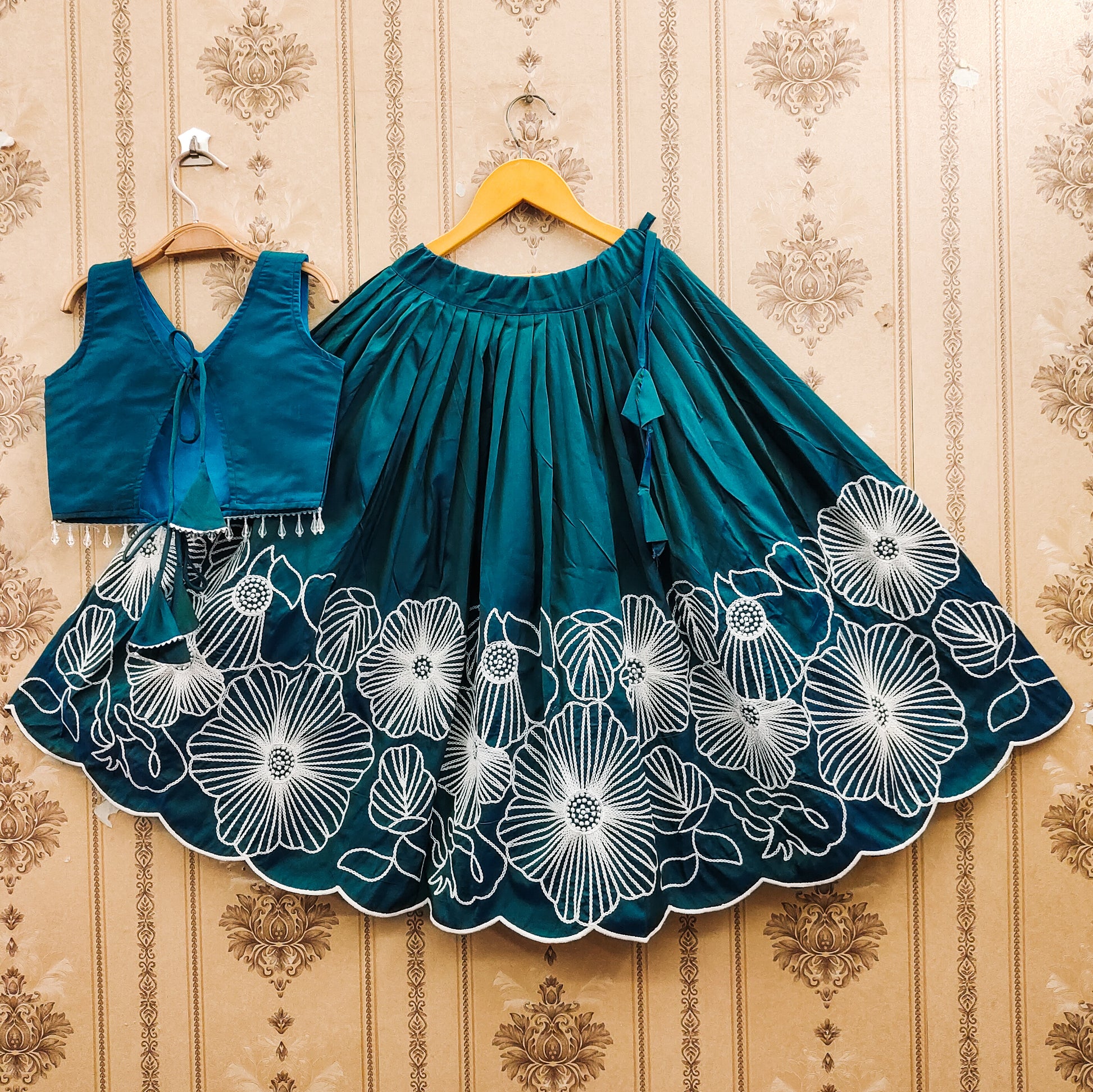 The ensemble features an intricately embroidered choli adorned with delicate cording, thread and dori work. Fully stitched and ready to wear, Rama color , it ensures both comfort and style for your little one. Perfect for festivals, weddings, birthdays, and family gatherings, this beautifully crafted outfit celebrates the playful elegance of childhood.