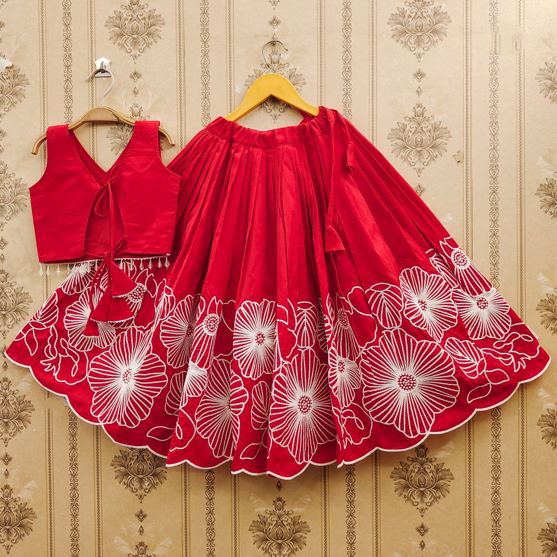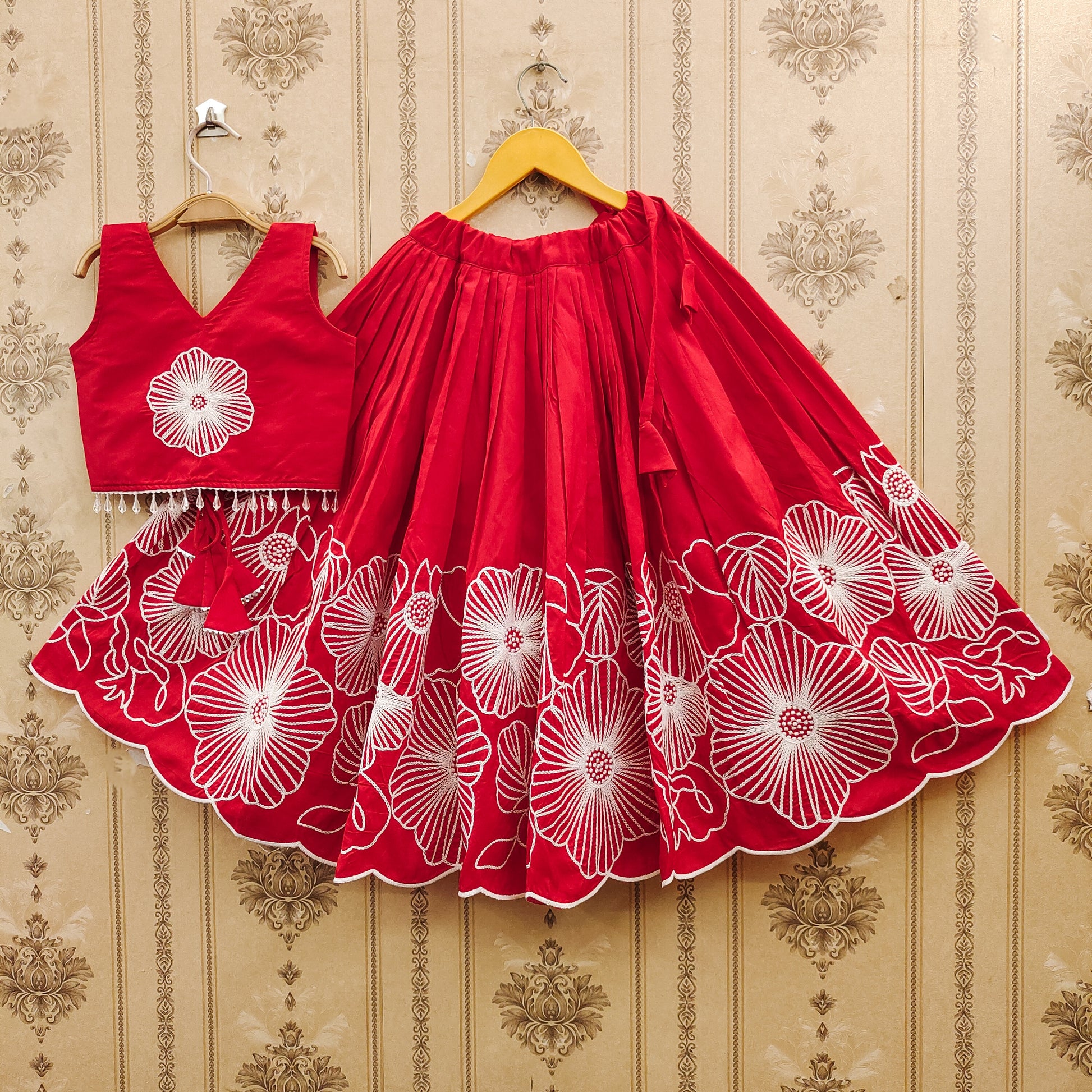 The ensemble features an intricately embroidered choli adorned with delicate cording, thread and dori work. Fully stitched and ready to wear, Red color , it ensures both comfort and style for your little one. Perfect for festivals, weddings, birthdays, and family gatherings, this beautifully crafted outfit celebrates the playful elegance of childhood.