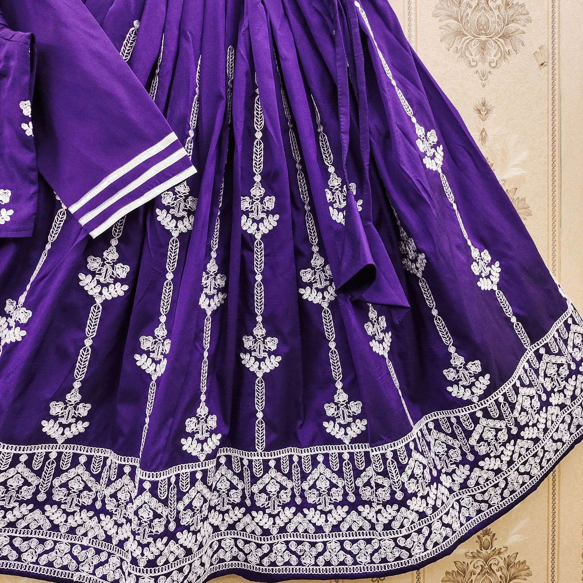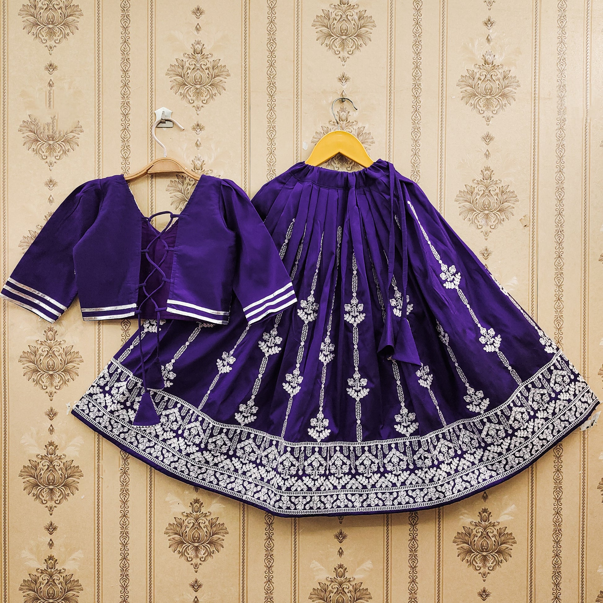 Made from high-quality fabric with violet (Jambali) color and fully stitched for easy wear, this outfit offers both style and convenience. The ensemble features a Embroidery-work choli with Cording Dori Work With fully stiched ready to wear. Ideal for festivals, weddings, birthday parties, and family celebrations, it's a perfect choice for showcasing the joyful essence of childhood in a graceful way. The ensemble features a Embroidery-work choli with Cording Dori Work With fully stiched ready to wear.