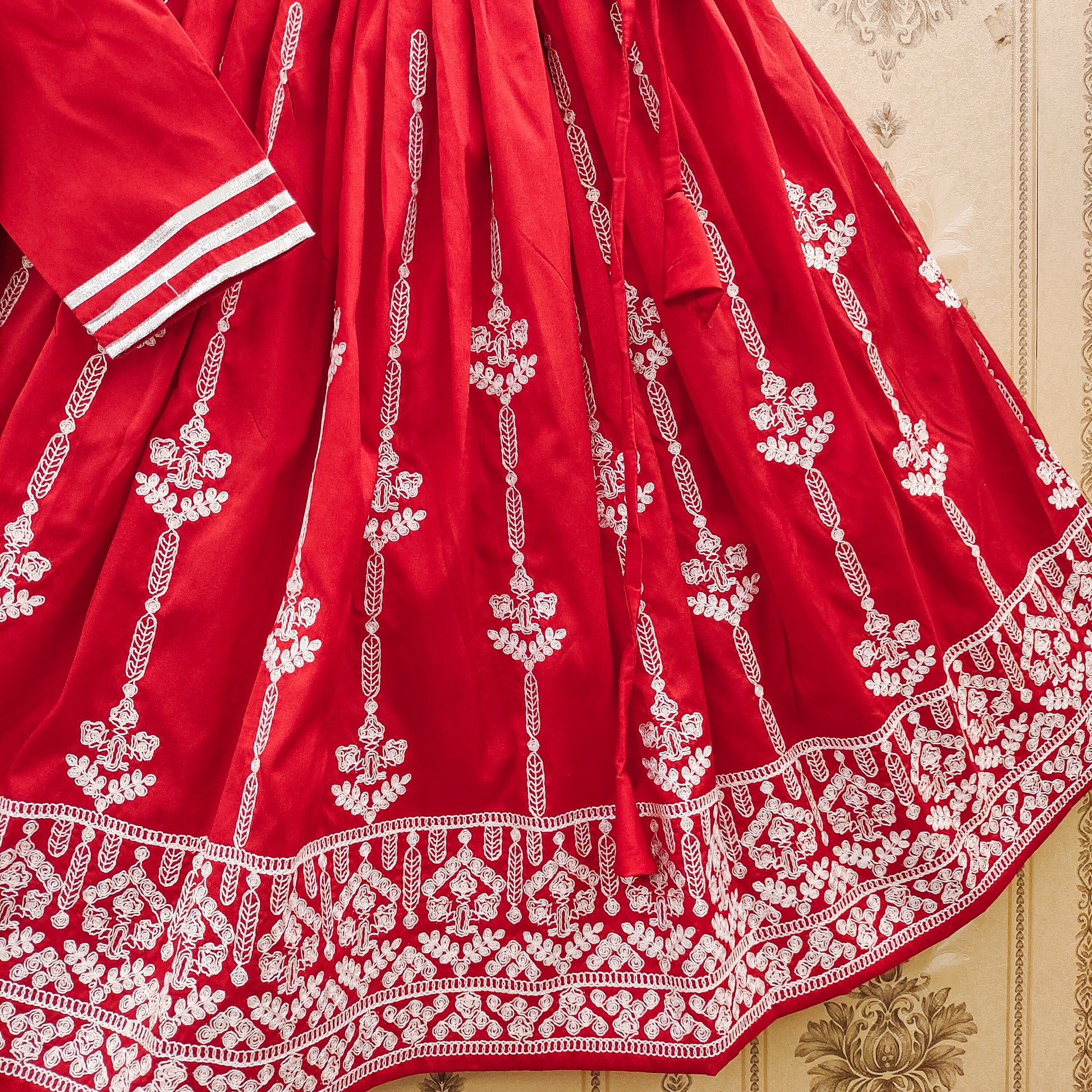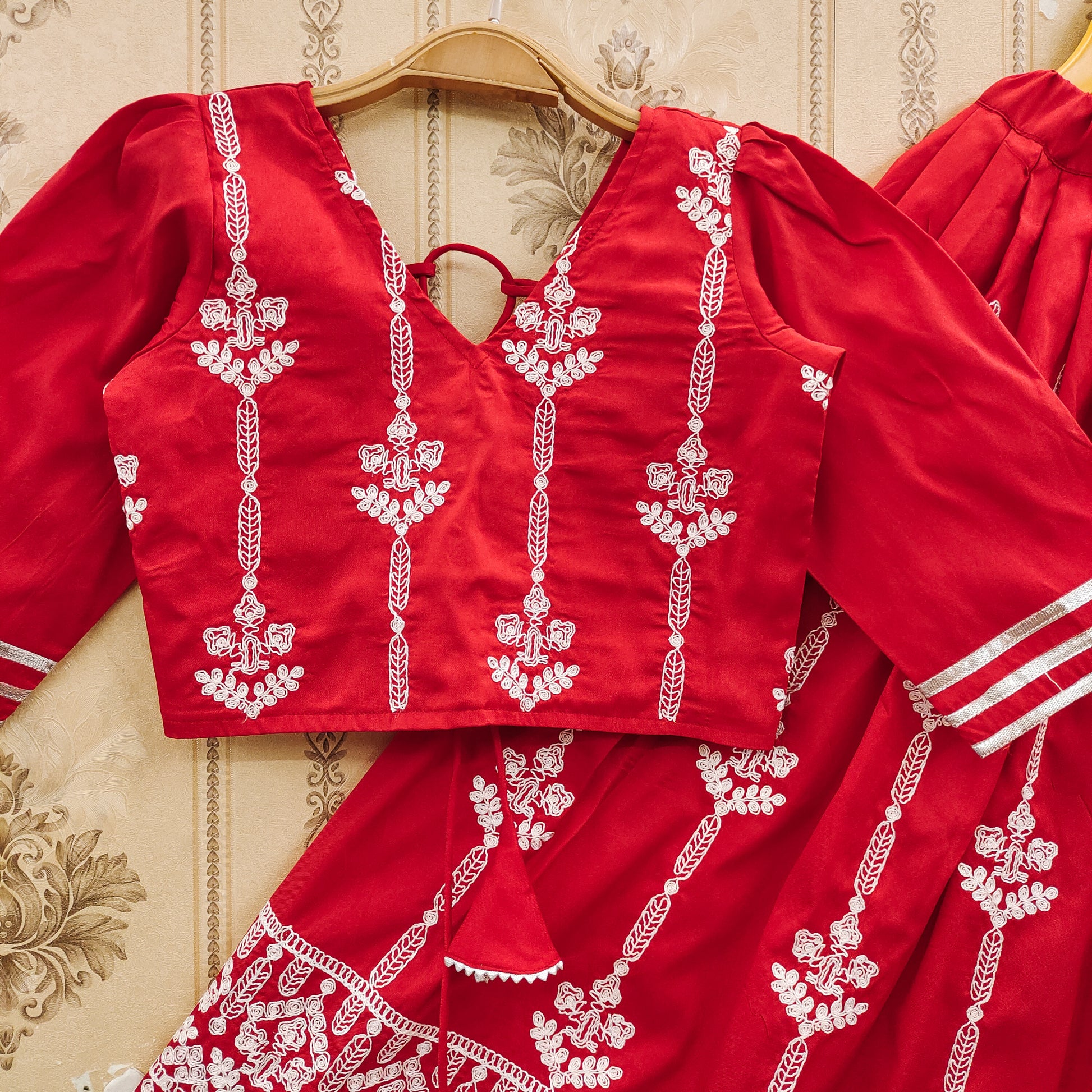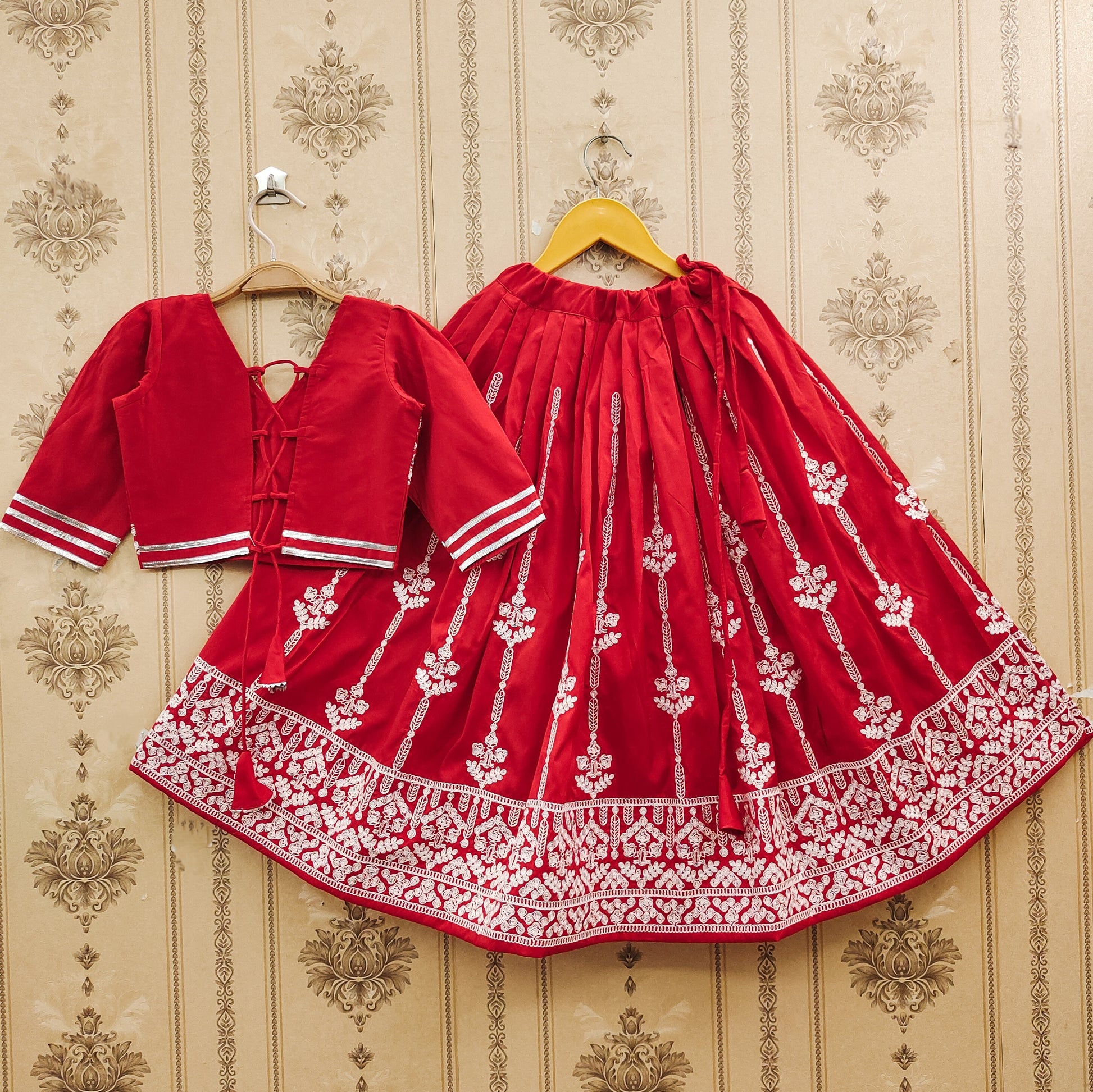 Made from high-quality fabric with Red color and fully stitched for easy wear, this outfit offers both style and convenience. The ensemble features a Embroidery-work choli with Cording Dori Work With fully stiched ready to wear. Ideal for festivals, weddings, birthday parties, and family celebrations, it's a perfect choice for showcasing the joyful essence of childhood in a graceful way. The ensemble features a Embroidery-work choli with Cording Dori Work With fully stiched ready to wear.